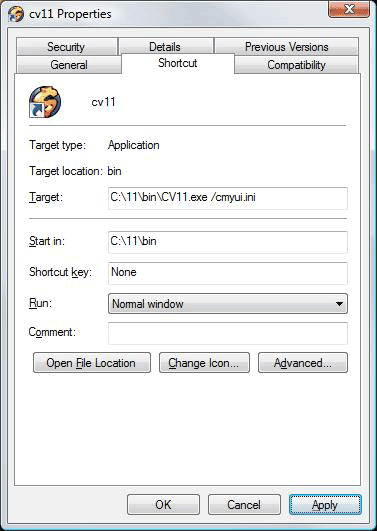 Target: CV11\bin\CV11.exe /cmyui.ini
