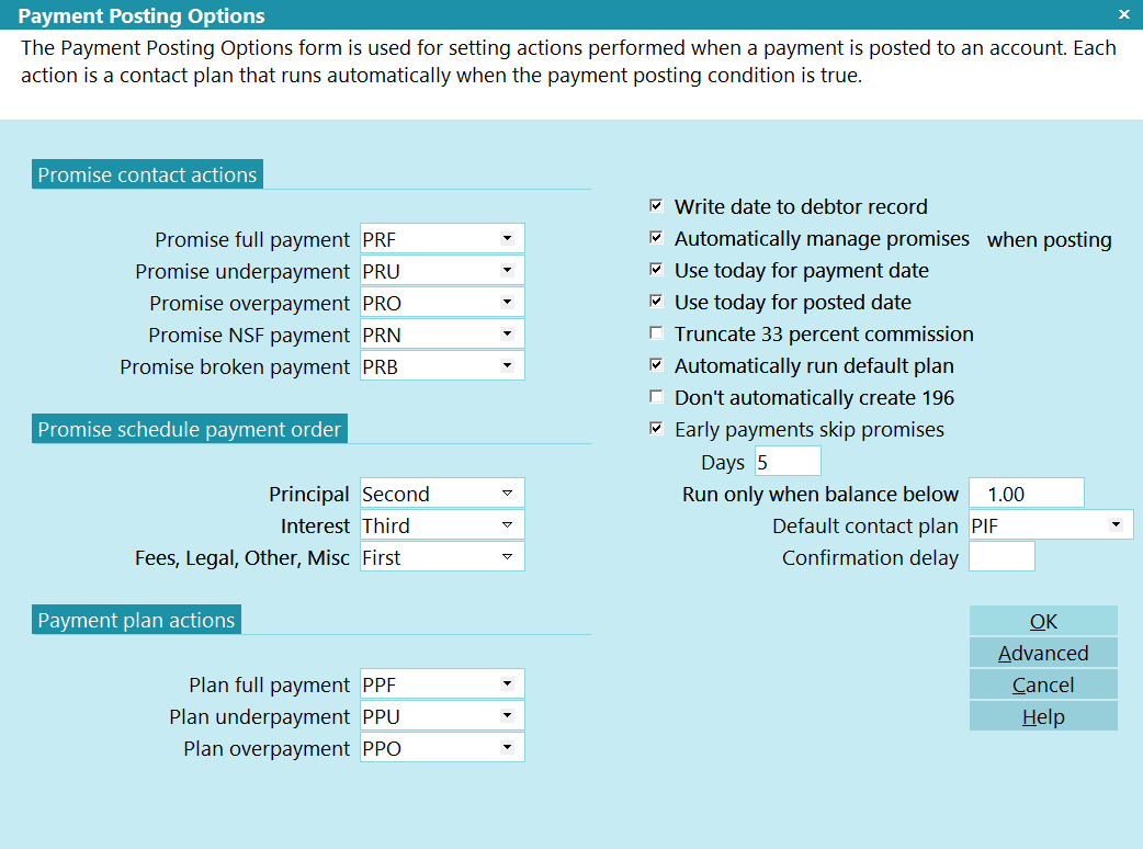 Promise Contact Actions in the Payment Posting Options form. Payment in Full, Overpayment, Underpayment, NSF