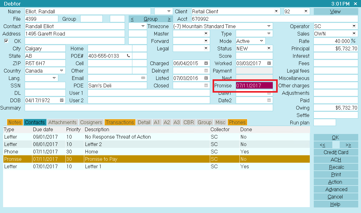 When you create a Promise contact, the due date of the Promise will be displayed on the Debtor form in the Promise field. The