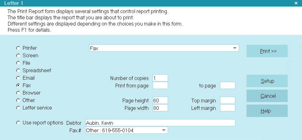 you wish to print from, and select the letter or report to print. Set the Print Destination to