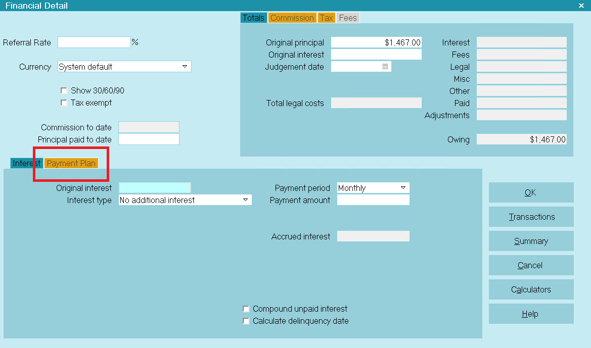 - Select the PAYMENT PLAN tab to display the Payment Plan form.