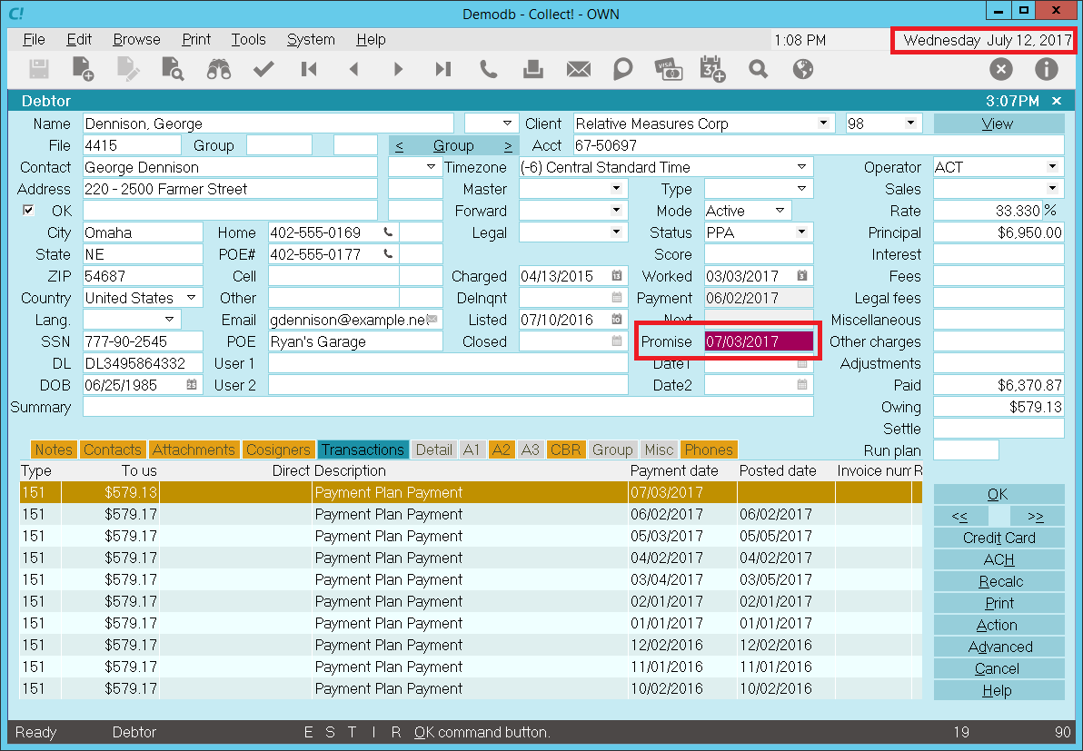 The 'Promise' field shows the date that the first payment is due. If the promised payment is not