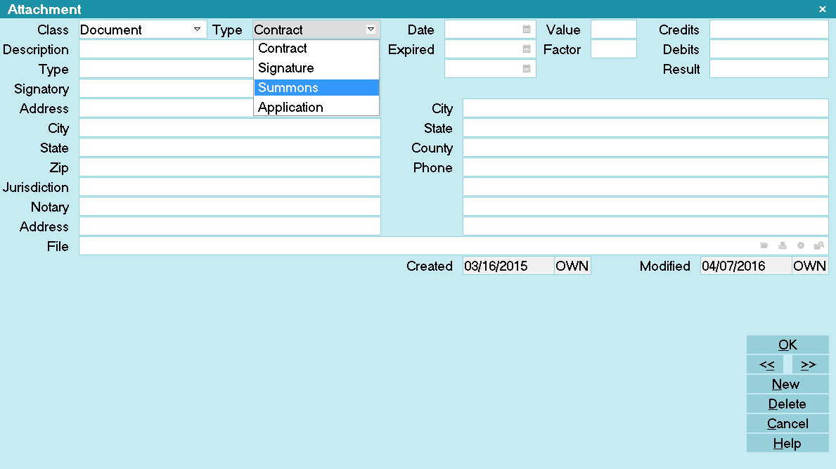 The Attachment form provides a convenient place for storing extra information about a debt, a Debtor,