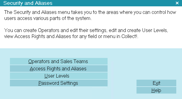 The next screen will be the Main Menu if you are a System type user, which the "OWN" ID is. "Collector"